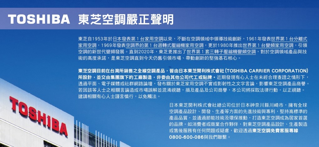 空調情報東芝空調嚴正聲明2022-06-01自1935年以來,東芝空調一直堅持創新,致力於以節能、環保的技術為台灣消費者打造舒適、安靜、清潔、可靠的室內氣候解決方案。 東芝空調隸屬於開利公司(NYSE: CARR),作為智慧氣候與能源解決方案的全球傑出供應商,始終致力於透過創新,帶來舒適、安全、永續的生活。 更多空調情報